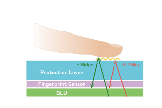 TFT 指纹扫描感测技术利用薄膜电晶体 (TFT) 当作光感测元件,,,,藉由非晶硅 (a-Si) 与低温多晶硅(LTPS)既有光电转换特性对不同波段光源进行吸收,,使感测 IC 读取阵列感测元件的光漏电差异,,,转换成数位灰阶影像。。