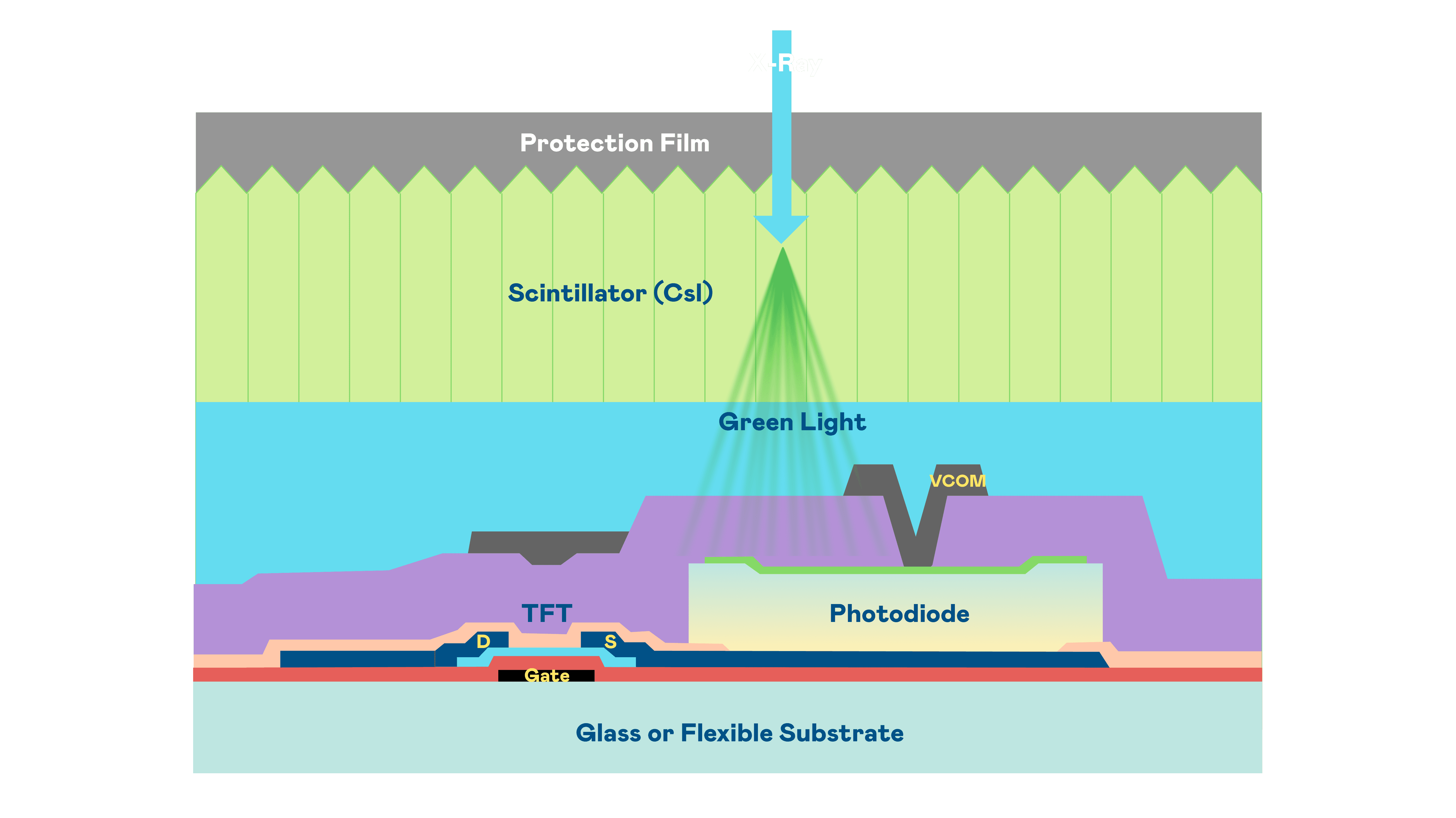 PG国际的X光影像感测阵列使用薄膜电晶体 (TFT) 作为每个像素的读取开关,,搭配光电二极体(Photodiode)的光电转换元件,,,,用以感测X光影像讯号。。。。